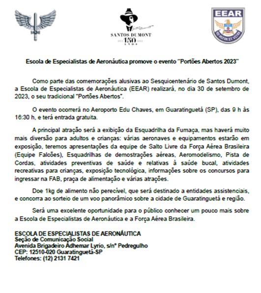 Dentro de comemorações alusivas aos 150 anos de Santos Dumont, a Escola de Especialistas de Aeronáutica, sediada na Estância Turística de Guaratinguetá, realiza o seu DIA DE PORTÕES ABERTOS.