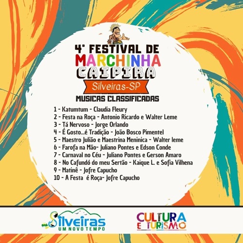 Devido às diversas solicitações de mais tempo para inscrição, a organização do 4º Festival de Marchinha Caipira de Silveiras estendeu até dia 18/JANEIRO, sábado, o prazo para os compositores interessados em apresentar suas obras para avaliação do Júri de Seleção.