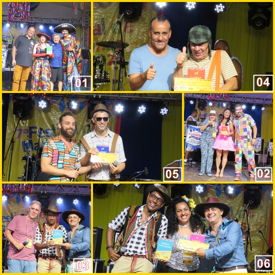 O topo do pódio dessa sétima edição do Festival foi ocupada por uma composição do estilo “duplo sentido”, com muita habilidade e bom humor, criada por Wagner Muzak, outro campeão de edições anteriores do mesmo Festival. Troféu de primeiro colocado e mais um bom valor em espécie. Na Foto 06, os vencedores recebendo a premiação entregue pela secretária de Cultura Aline Damásio.