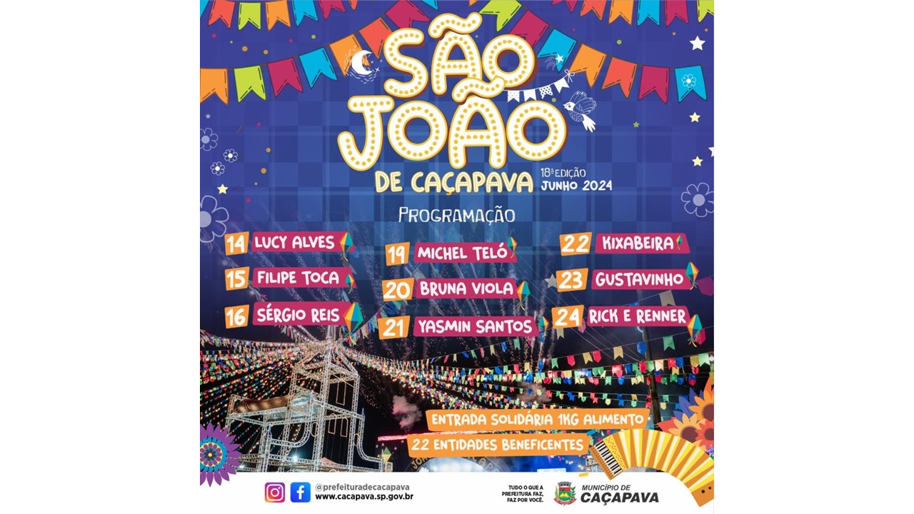 A Prefeitura de Caçapava, por meio da Secretaria de Cultura e Turismo, definiu a programação de shows do Festival São João de Caçapava 2024. Considerado um dos maiores eventos juninos do Estado de São Paulo, neste ano terá nove dias de atrações, de 14 a 16 e de 19 a 24 de junho. A festa acontece no espaço de eventos da Av. Brasil (próximo à Rodoviária).