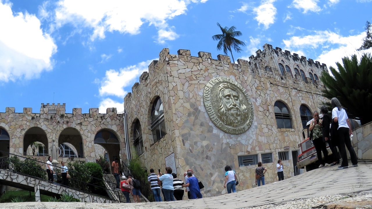 Uma construção a qual remete aos tempos dos castelos da Idade Média se eleva do topo do terreno onde está, em Roseira (SP), contrapondo-se ao fundo azul celeste.