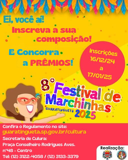 A prefeitura da Estância Turística de Guaratinguetá, por meio de sua Secretaria de Cultura, sai mais uma vez na frente e anuncia, desde o último dia 16 de dezembro, a realização do seu Festival de Marchinhas Carnavalescas, desta feita sob a edição de número oito.