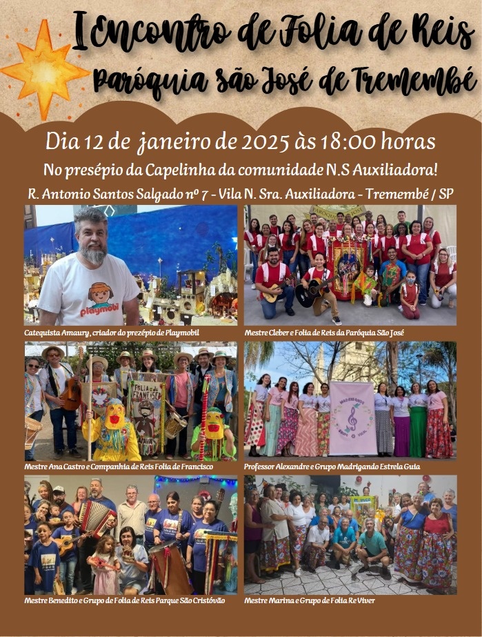 A Folia de Reis marcou o encerramento do Natal Iluminado 2024 mas, também, serviu para se anunciar a realização do 1º Encontro de Folia de Reis da Paróquia São José de Tremembé, agendado para o dia 12 de janeiro, a partir das 18h, junto ao presépio da Capelinha da Comunidade Nossa Senhora Auxiliadora, à rua Antônio Santos Salgado, nº 7, Vila Nossa Senhora Auxiliadora, em Tremembé, SP.