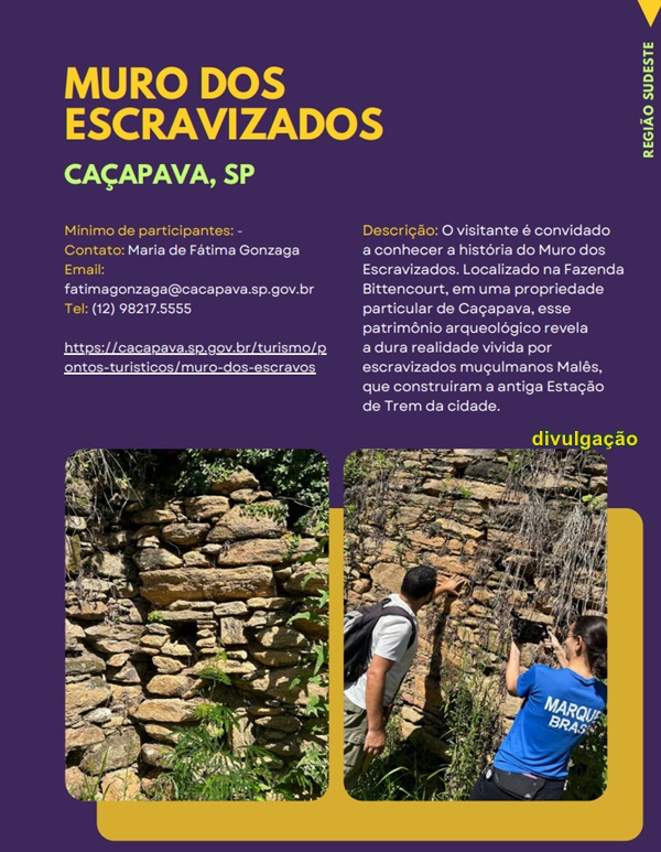 es pelo afro-turismo e pela valorização das referências naturais da ancestralidade regional, já está contida no Guia Turístico de Religiões de Matrizes Africanas e Indígenas, lançado recentemente pela Secretaria de Turismo e Viagens do Estado de São Paulo, e, agora, é uma das 16 cidades paulistas a compor o mapeamento da Região Sudeste, dentro desse novo material que é o Guia do Afroturismo no Brasil, na página 50, com o "Muro dos Escravizados".