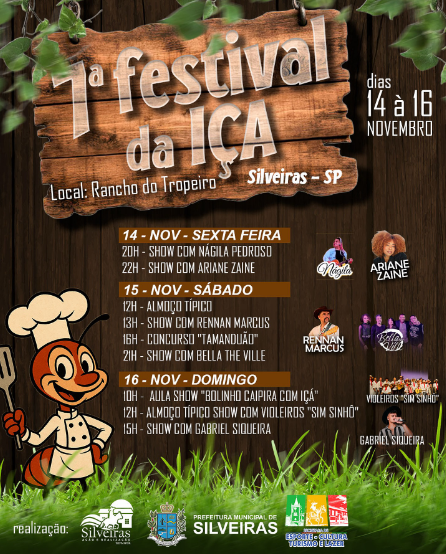 Atrações confirmadas: Nágila Pedroso, Ariane Zaine, Rennan Marcus, Bella La Ville, Violeiros “Sim Sinhô” e Gabriel Siqueira!