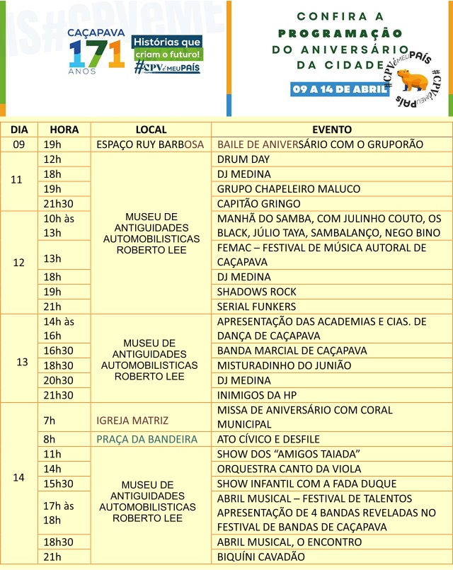 CAÇAPAVA: Cidade completa 171 anos com grande agenda de celebrações