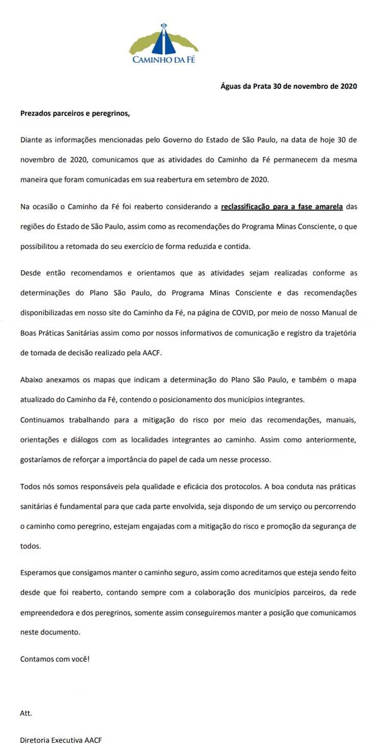 A Associação Caminho da Fé publica importante nota a respeito dos protocolos sanitários. Veja a íntegra.