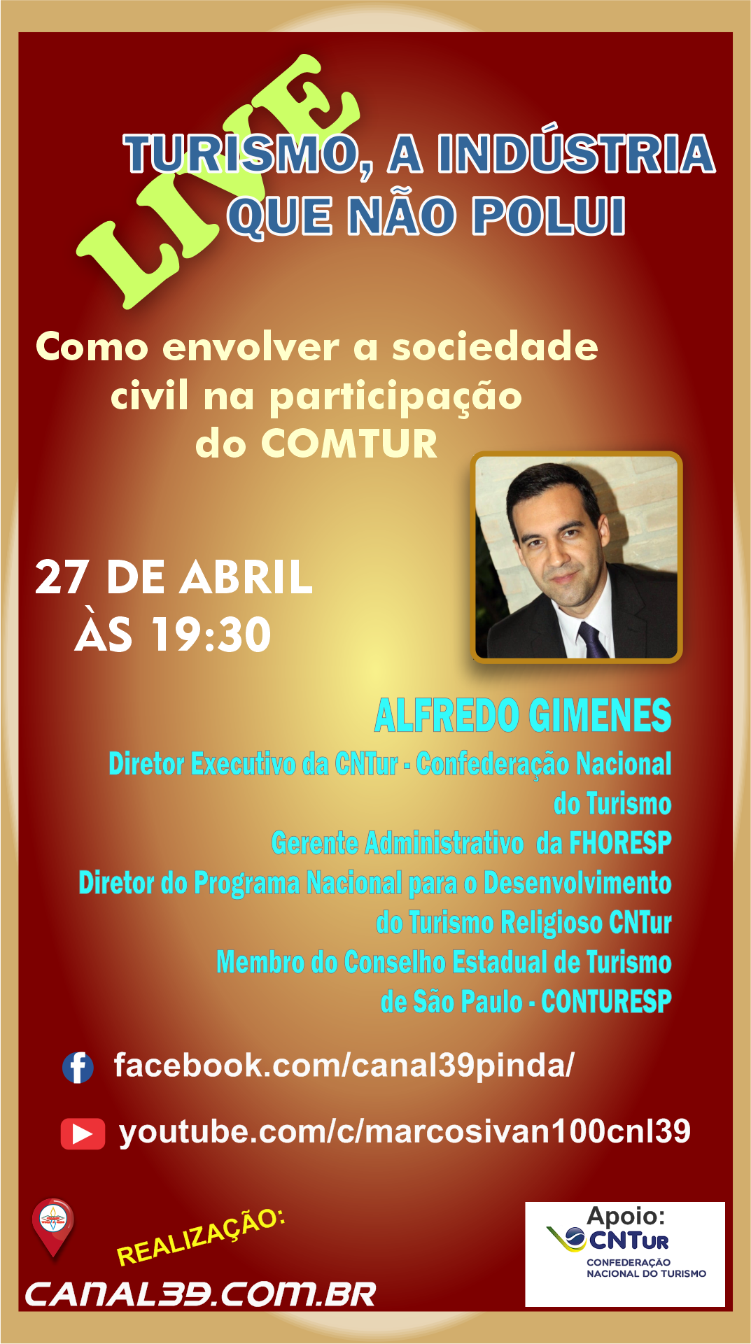 Prosseguindo com a série de eventos on-line, focados na maior motivação para a promoção do Turismo Receptivo, a direção do Canal39 anuncia, para próximo dia 27 de abril, a partir das 19h30, a presença de Alfredo Gimenes, profissional especializado em Turismo.
