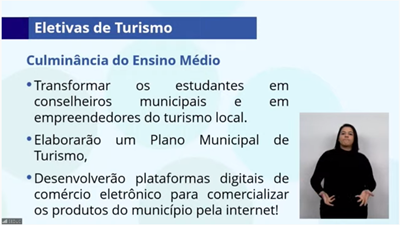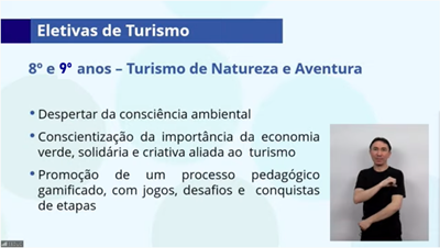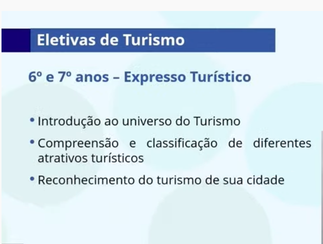 A Secretaria de Educação disponibiliza, na plataforma acessada pelos educadores, a proposta dessas eletivas para o ensino do turismo. Naturalmente os professores poderão optar pela sua adoção total ou parcial, haja vista a necessidade – natural – de se obedecer ao Plano de Ensino de cada um.