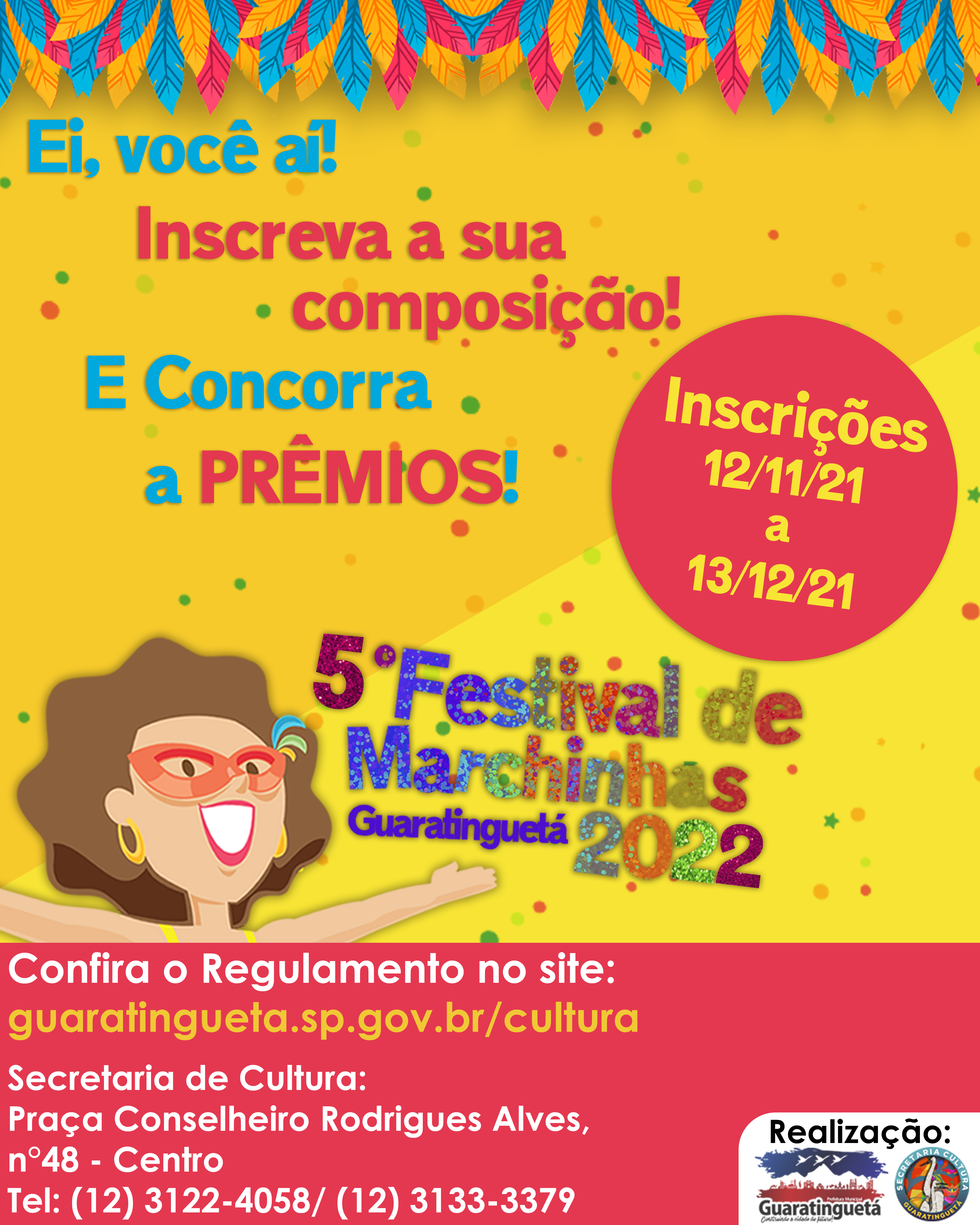 A partir de 12 de novembro, sexta-feira, a Secretaria de Cultura da Estância Turística de Guaratinguetá – SP atenderá aos interessados em participar da quinta edição do seu concorrido Festival de Marchinhas.