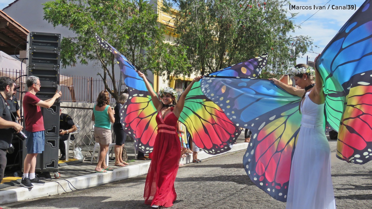 AS borboletas abriram o desfile, narrado com tons de emoção por Preta Valério e Dheminho Montesi, comboiando carretas alegóricas e grupos de famílias com as tradições pulsando na pele e nas veias, trajando ao estilo da época de sua chegada ao Brasil.