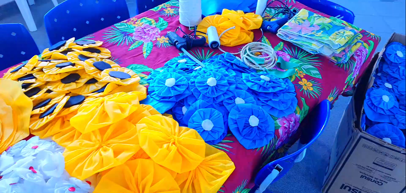 As flores são confeccionadas por meio da técnica artesanal conhecida como fuxico (trouxinhas de tecidos, costuradas de maneira a proporcionar bonito efeito visual pelo contraste de cores) e serão novidade na procissão de Corpus Christi.