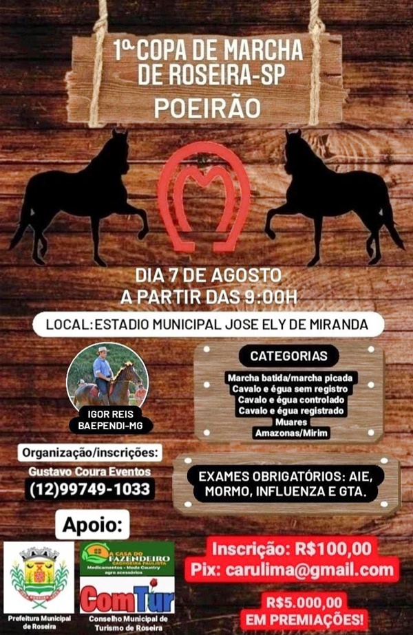 Além das atrações musicais, Roseira promove a 1ª Copa de Marcha no Estádio José Ely de Miranda, no domingo (7) a partir das 09h.