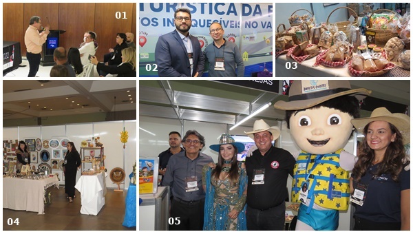 ACIMA: 01) Palestra de Vanilson Flickert; 02) Mateus e Marcos, secretário e diretor de Cultura e Turismo da Estância de Cunha; 03) Alguns alimentos expostos por participantes do SSPT; 04) Praça do Artesão; 05) Usando óculos; Cal Ribeiro, prefeito de Viradouro; a Rainha do Rodeio de Barretos; Sérgio Rondini, Chefe de Gabinete da Secretaria de Turismo de Barretos; Duduzinho; Jackeline Mesquita, RT Águas Sertanejas.