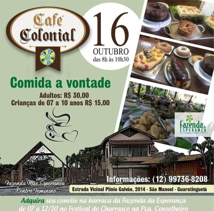 O Centro Feminino da Fazenda da Esperança, em Guaratinguetá, realiza - no domingo 16 - um imperdível Café Colonial, devendo receber muitas famílias para apreciarem momentos de integração e degustação de bons produtos.