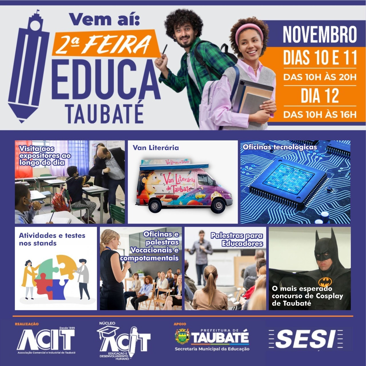 Uma realização conjunta da ACIT - Associação Comercial e Industrial de Taubaté, por meio de seu Núcleo de Educação e Desenvolvimento Humano, Prefeitura de Taubaté e SESI - Serviço Social da Indústria, a segunda edição da Feira Educa Taubaté acontece a partir do dia 09 de novembro e deve reunir educadores e estudantes da cidade e das cidades da região. O Canal39 divulga material recebido.