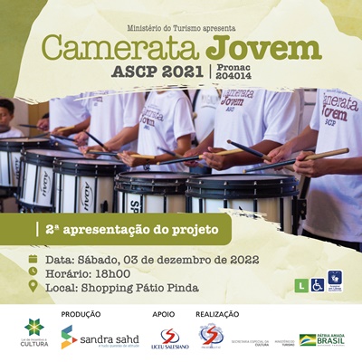 Viabilizado pela Lei Federal de Incentivo à Cultura, “Camerata Jovem ASCP” é apresentado pelo Ministério do Turismo (via Secretaria Especial de Cultura) com realização da Associação dos Cooperadores Salesianos de Pindamonhangaba e produção de Sandra Sahd.