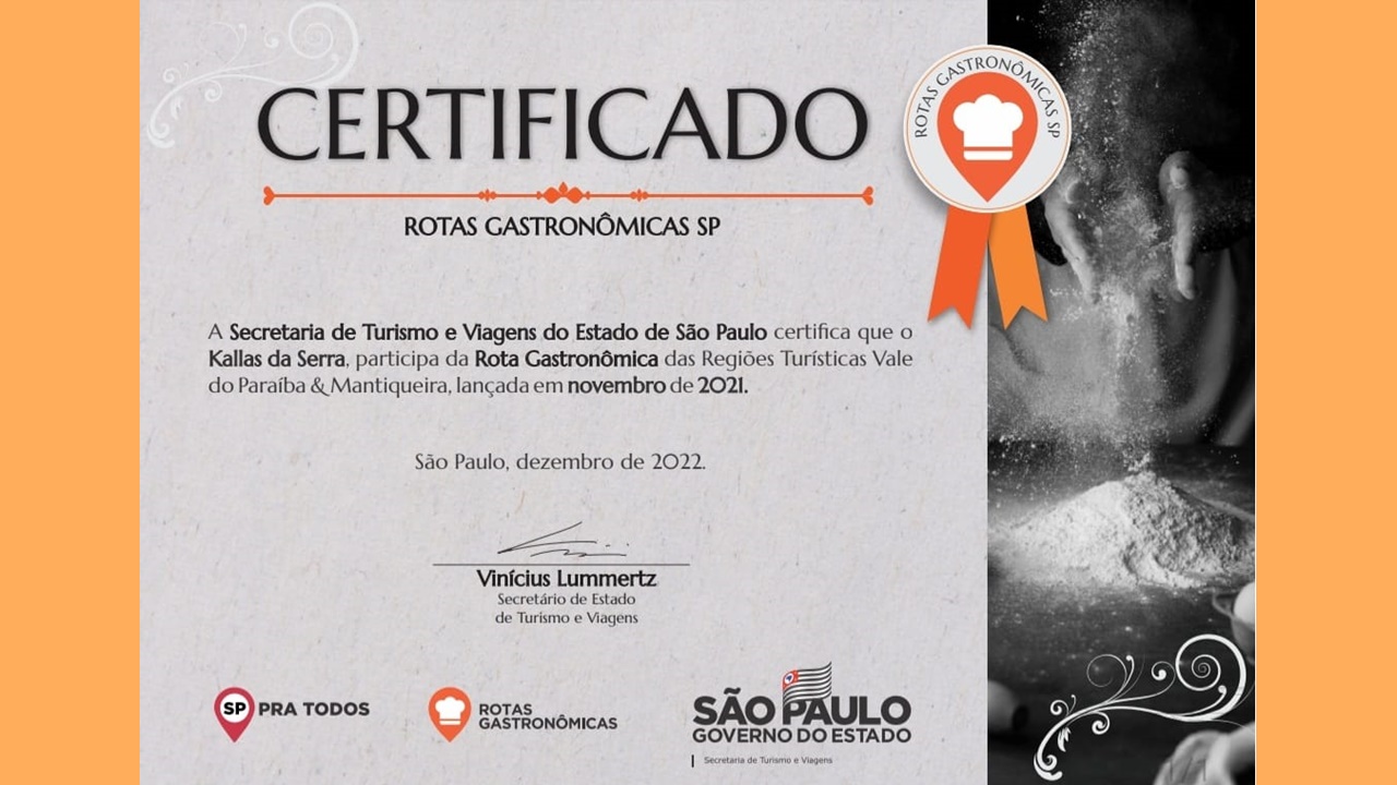 CERTIFICAÇÃO: Kallas da Serra é referência nas Rotas Gastronômicas do Estado de SP
