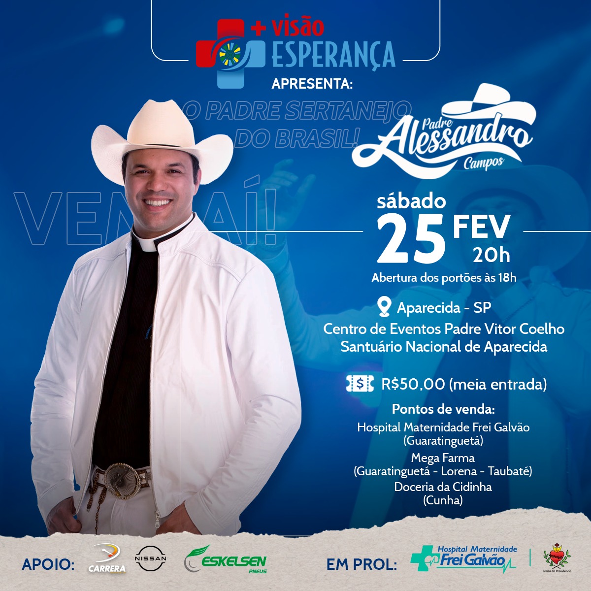 A Fazenda da Esperança dá apoio ao grandioso show com Padre Alessandro Campos, neste dia 25 de fevereiro, agendado para acontecer no Centro de Eventos Padre Vitor Coelho, no Santuário Nacional de Aparecida.