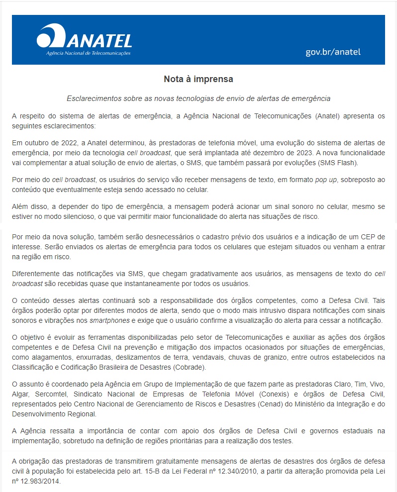 A Assessoria de Comuniação da ANATEL - Agência Nacional de Telecomunicações, expediu, agora à tarde, "NOTA À IMPRENSA" a respeito dos mecanismos de aviso aos consumidores dos serviços de telefonia móvel no tocante aos avisos de emergências .