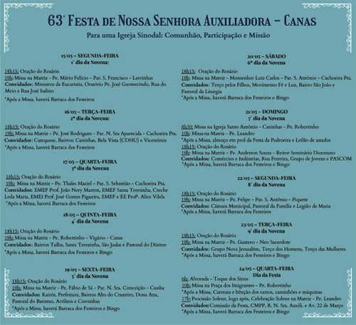 Na parte religiosa há uma programação iniciada já no dia 15, com diversos momentos acontecendo na sede da Paróquia.