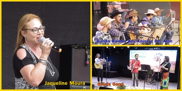 Saiu Jaqueline chegou a Banda Rainha dos Anjos, com padre Alan. Aí foi muito bom ouvirmos grandes sucessos do repertório sertanejo raiz, uma breve amostra do estilo sofrência e muito mais, bem executados. Apesar da chuva caindo, todos continuavam aplaudindo.