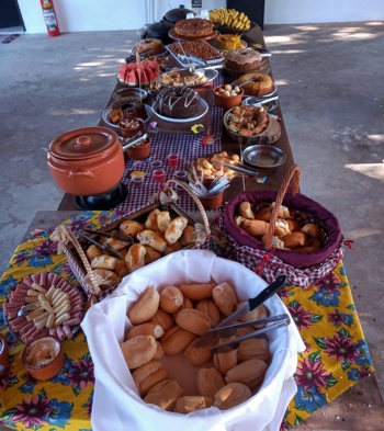 Bem servida mesa de opções, com bolos de milho, cenoura, chocolate, churros, laranja, fubá; salgadinhos tradicionais; tortas de frango e brócolis; arroz doce, canjica; frutas frescas; biscoitos, bolachas, sucos, tábua de frios, inclusive queijo mineiro, laticínios, ovos mexidos, salsicha ao molho de tomate (esses dois últimos pratos são requisitados em todas as mesas de café).