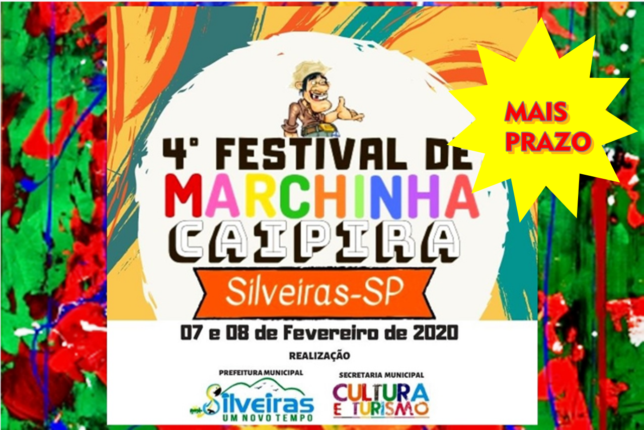 Devido às diversas solicitações de mais tempo para inscrição, a organização do 4º Festival de Marchinha Caipira de Silveiras estendeu até dia 18/JANEIRO, sábado, o prazo para os compositores interessados em apresentar suas obras para avaliação do Júri de Seleção.