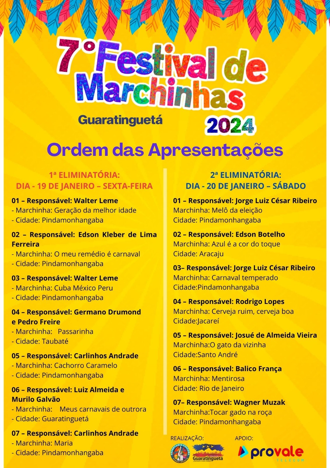 Em sua sétima edição, e a cada uma delas ganhando mais admiradores e participantes, o Festival de Marchinhas de Guaratinguetá tem início hoje, na Praça Conselheiro Rodrigues Alves, no Centro, trazendo para apreciação do público e do corpo de jurados a primeira grade de concorrentes.
