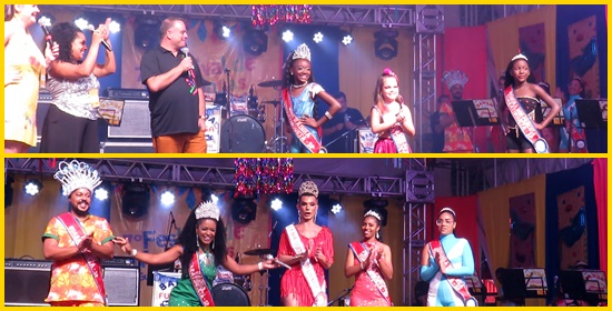 Melhor Figurino foi o troféu concedido à dupla defensora de “Passarinha” (Germano Drummond e Pedro Freire). Érika vestiu pink com capa transparente em led. Segundo Drummond, seu figurino consumiu 700 retalhos de tecido para o trabalho de patchwork executado por sua mãe. A marchinha representou Taubaté. Na Foto 02, a diretora artística do Festival, Tereza Barbosa, entrega o troféu aos selecionados.