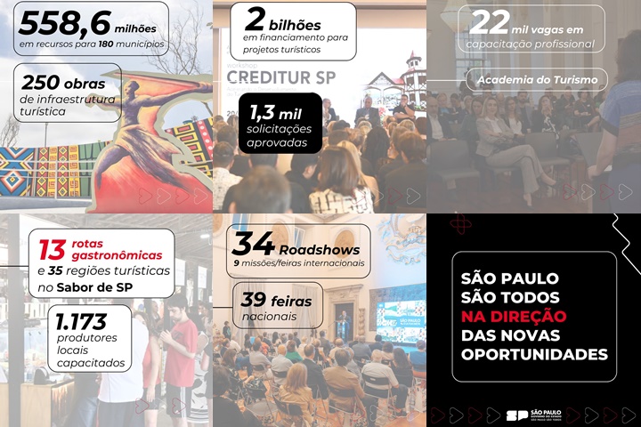 Em 23 meses de gestão, o Governo de São Paulo, por meio da Secretaria de Turismo, inaugurou 250 obras de melhorias em acessos, construção de novos espaços de lazer e diversos equipamentos turísticos em mais de 100 municípios paulistas, reforçando o compromisso com o desenvolvimento e a revitalização do turismo no Estado.