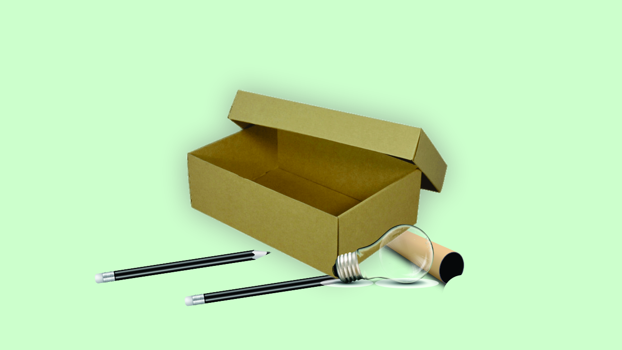 Arranjou uma caixa de sapatos, um tubinho de papelão (parecido com aqueles de papel higiênico), um soquete com lâmpada, fio e plugue para tomada elétrica. Num segundo momento, folha de papel de seda branco, lápis de cor e caneta, dois lápis novos e lentes de óculos.