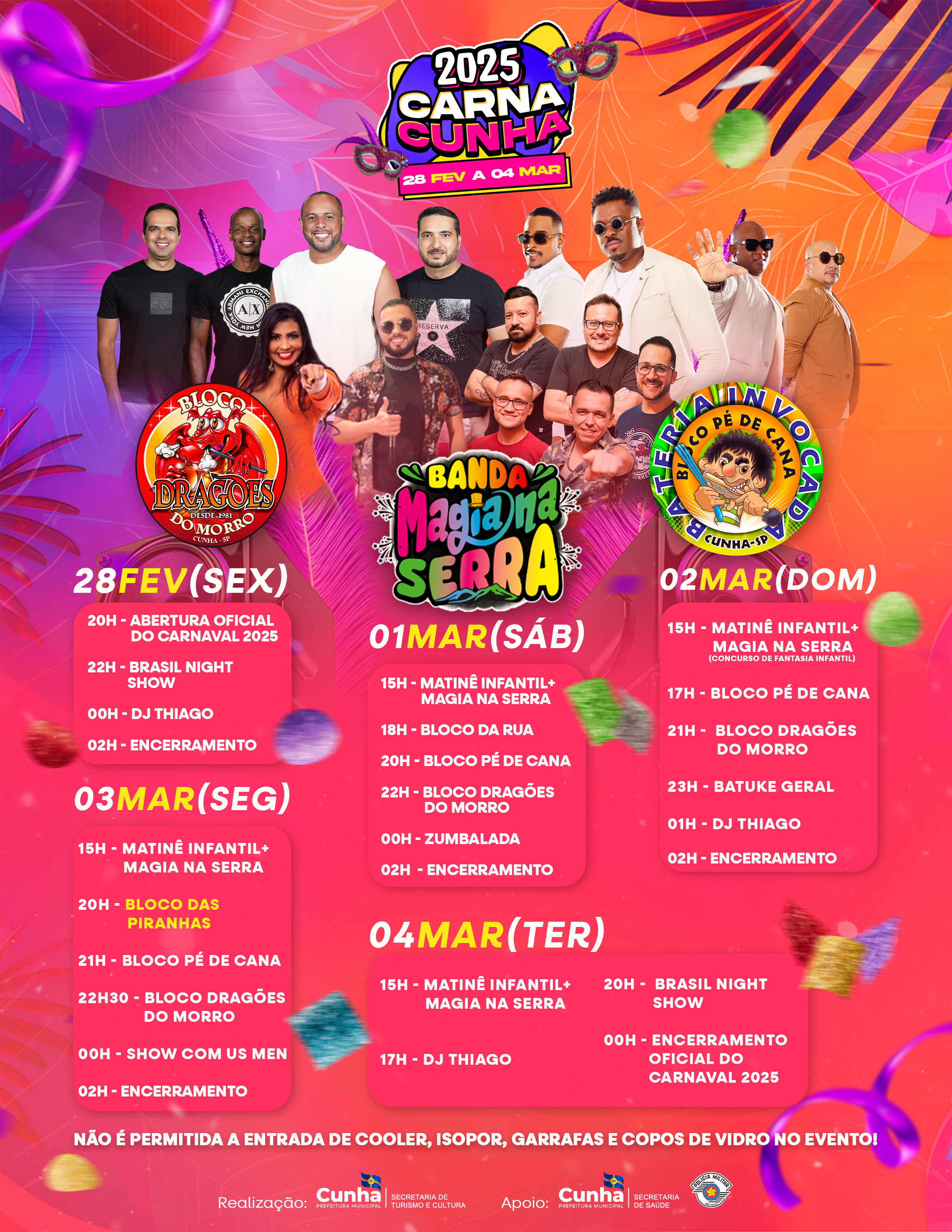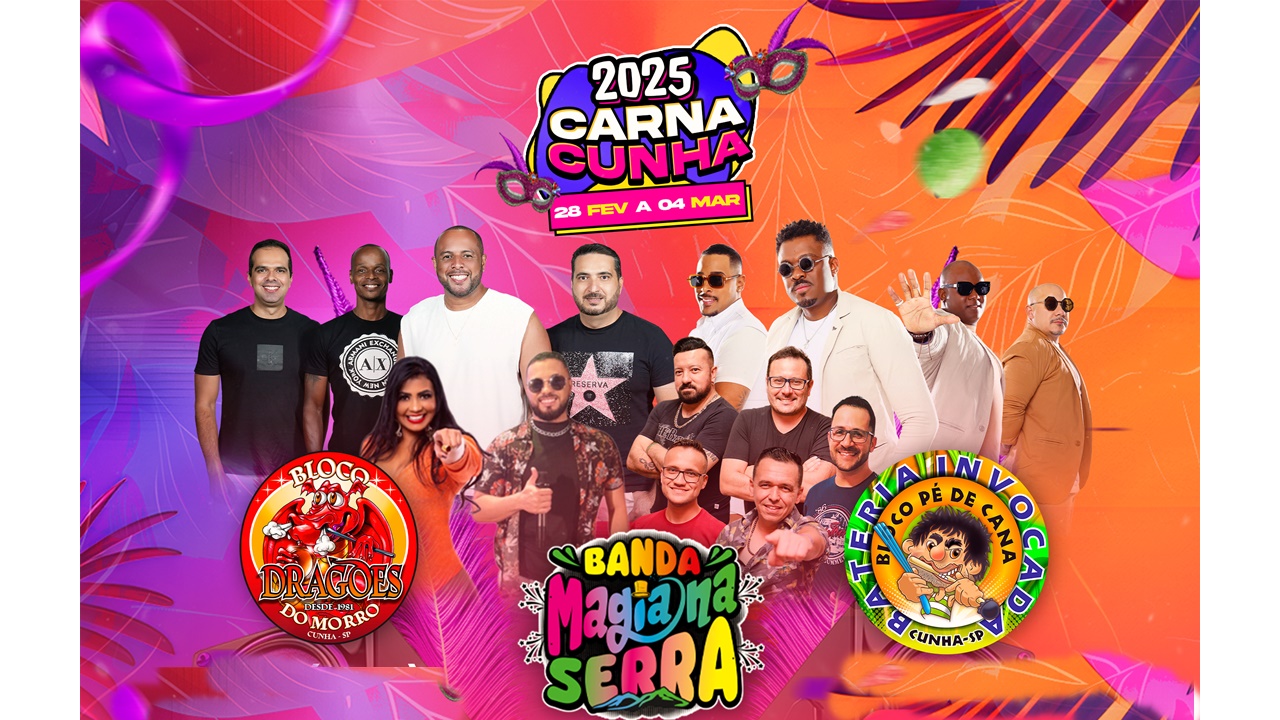 Cunha mantém viva a tradição dos blocos carnavalescos cheios de energia e alegria. A cidade promete várias opções de diversão nas ruas, com os blocos das Piranhas, Pé de Cana e Dragões do Morro, que resgatam as raízes do carnaval de rua com muita criatividade e animação. Além disso, a Praça da Matriz será o palco de shows ao vivo com bandas regionais e apresentações especiais, oferecendo uma programação que agrada a todos os públicos.