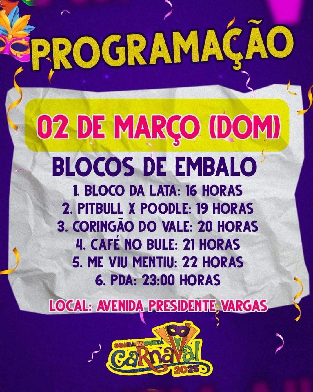 Veja a programação dos desfiles de domingo e segunda-feira de Carnaval em Guaratinguetá: