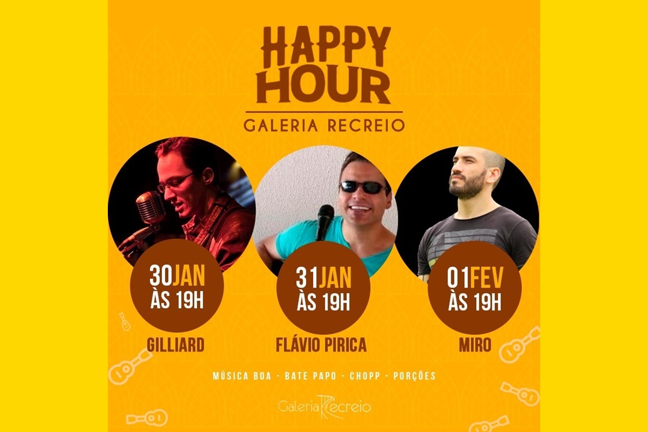 A Galeria Recreio, em Aparecida, lançou o projeto Happy Hour, que traz uma programação musical gratuita para animar as noites dos turistas e moradores da região. Todas as quintas, sextas e sábados, a Praça de Alimentação do espaço contará com apresentações de músicos regionais, cantando os novos sucessos e, também, os clássicos da música popular brasileira. Nesta semana as atrações são: na quinta (30/01) o cantor Giliard, na sexta (31/01) Flávio Pirica e no sábado (01/02) o músico Miro. Acompanhe as Redes Sociais da Galeria e fique por dentro da programação semanal de eventos. O espaço está localizado na Praça Nossa Senhora Aparecida, no Centro Histórico de Aparecida, entre a Basílica Velha e a Passarela da Fé.'