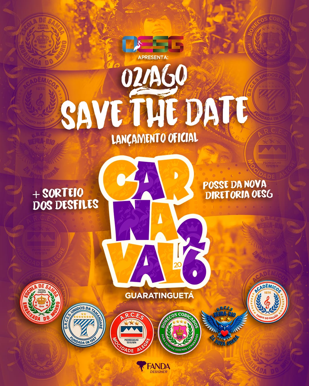 A ordem do desfile das Escolas de Samba, em 2026, será definida por sorteio programado para acontecer no dia 02 de agosto, quando acontecem a posse oficial da nova diretoria da OESG e o lançamento do Carnaval 2026 da Estância Turística de Guaratinguetá.