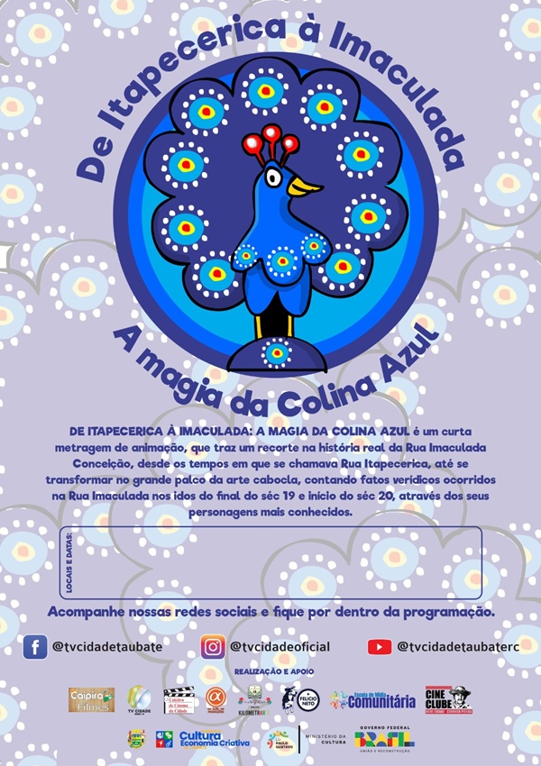 Na próxima sexta-feira, 29 de agosto, às 18 horas, o pátio da Igreja Nossa Senhora Imaculada Conceição será transformado em "sala de cinema" para receber o lançamento do filme "De Itapecerica à Imaculada, A Magia da Colina Azul", produzido pela Caipira Filmes, com produção executiva, direção e roteiro de Cláudia Mello. Os desenhos, colorização e animação são de Rodrigo Ayres, da ACME Produções. A atividade integra a programação da 64ª Festa do Folclore de Taubaté.