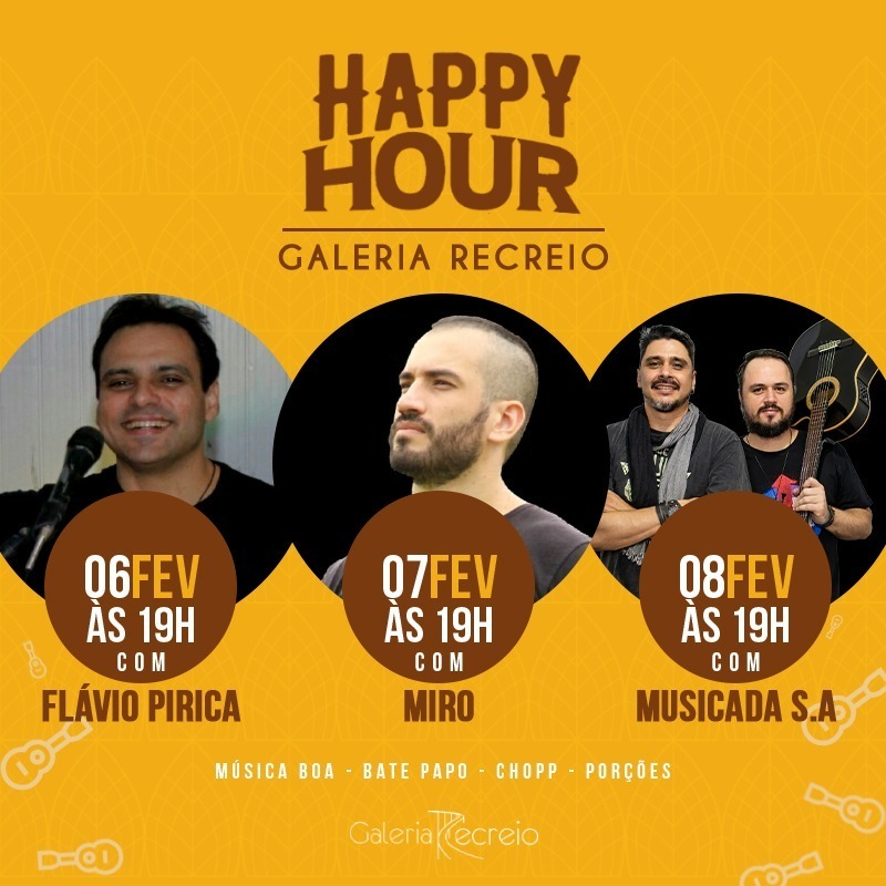 A Galeria Recreio, em Aparecida, lançou o projeto Happy Hour, com uma programação musical gratuita para animar as noites dos turistas e moradores da região. Todas as quintas, sextas e sábados, a Praça de Alimentação do espaço contará com apresentações de músicos regionais, cantando os novos sucessos e, também, os clássicos da música popular brasileira.