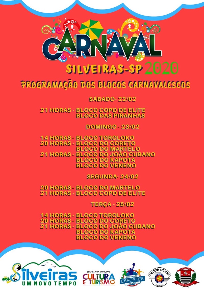 Considerado um dos melhores carnavais, por seu estilo bastante acessível,haja vista ser realizado em praça pública, o Carnaval de Silveiras deve receber, em 2020, maior número de foliões, além dos já acostumados com a festa popular.