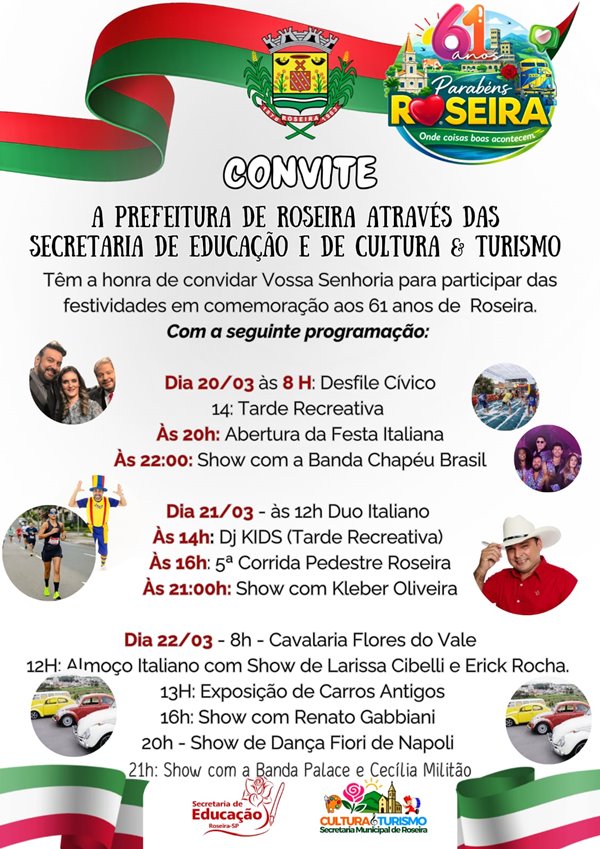 Comemorações têm grandes atrações e a primeira Festa Italiana da Roseira