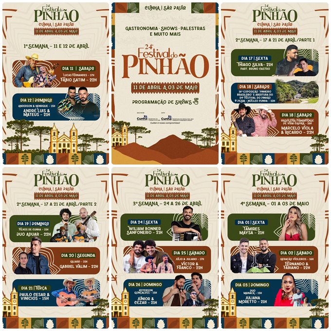 A Prefeitura da Estância Turística de Cunha, por meio da Secretaria de Turismo e Cultura, apresenta oficialmente a grade de shows para o aguardado 24º Festival do Pinhão. O evento, que é um dos maiores pilares do calendário cultural e gastronômico do Vale do Paraíba, acontece entre os dias 11 de abril e 03 de maio.