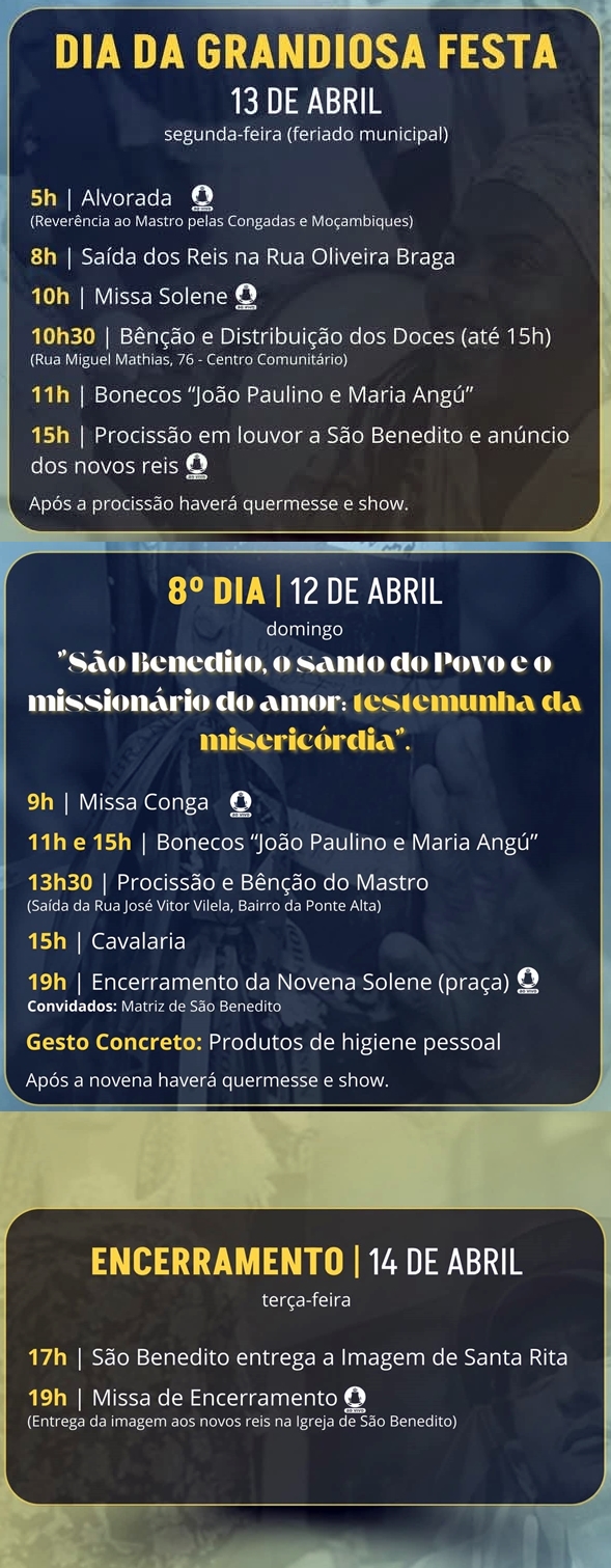 Eis a programação dos 3 últimos dias de homenagens a São Benedito e, ainda, a Santa Ifigênia e Nossa Senhora do Rosário dos Homens Pretos: