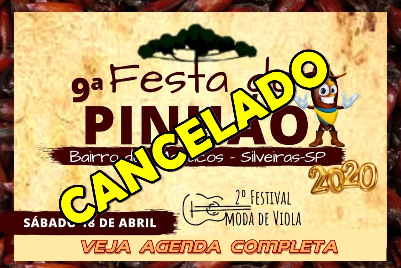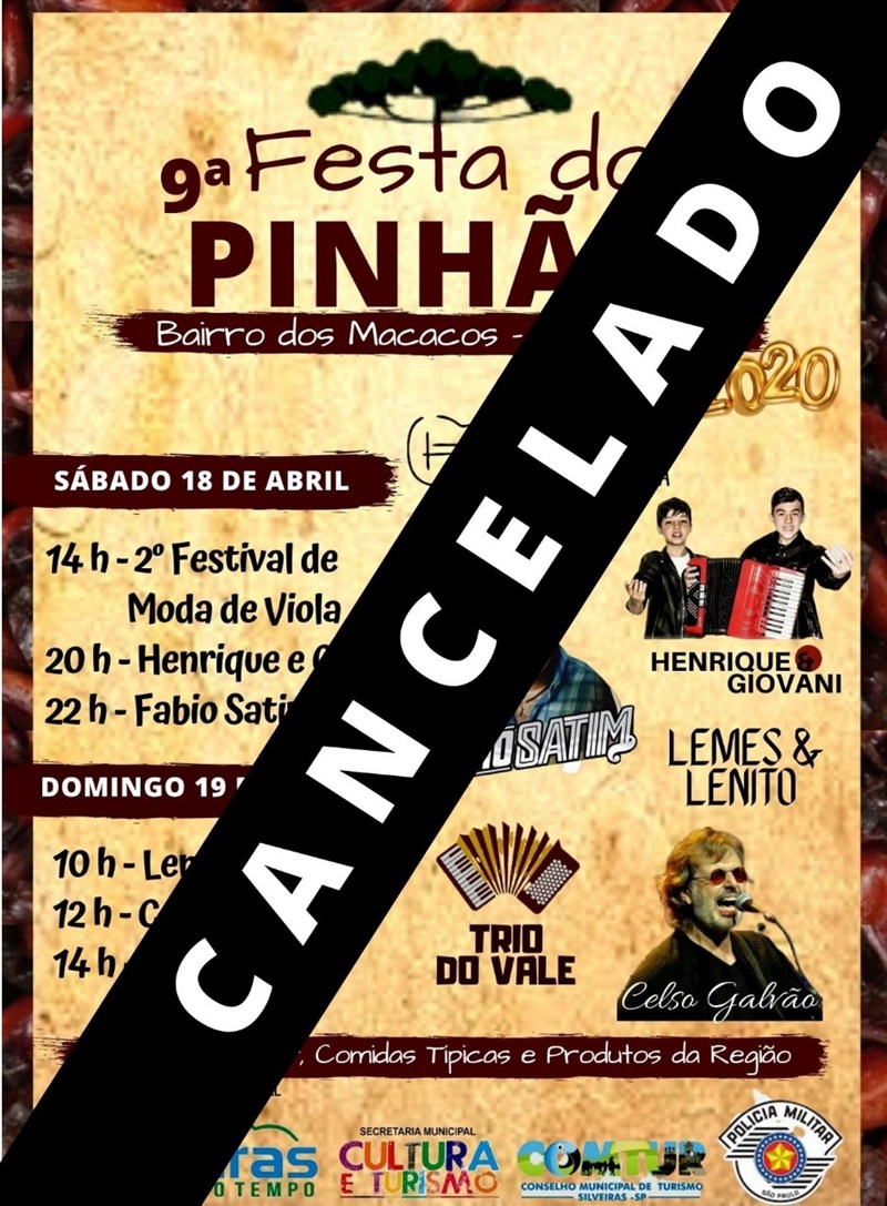 A Prefeitura Municipal de Silveiras comunica a todos o cancelamento da 9ª Festa do Pinhão e do 2º Festival de Moda de Viola no Bairro dos Macacos, por conta das atuais medidas determinadas pelas autoridades sanitárias, preventivas à ameaça do Coronavirus (COVID-19).