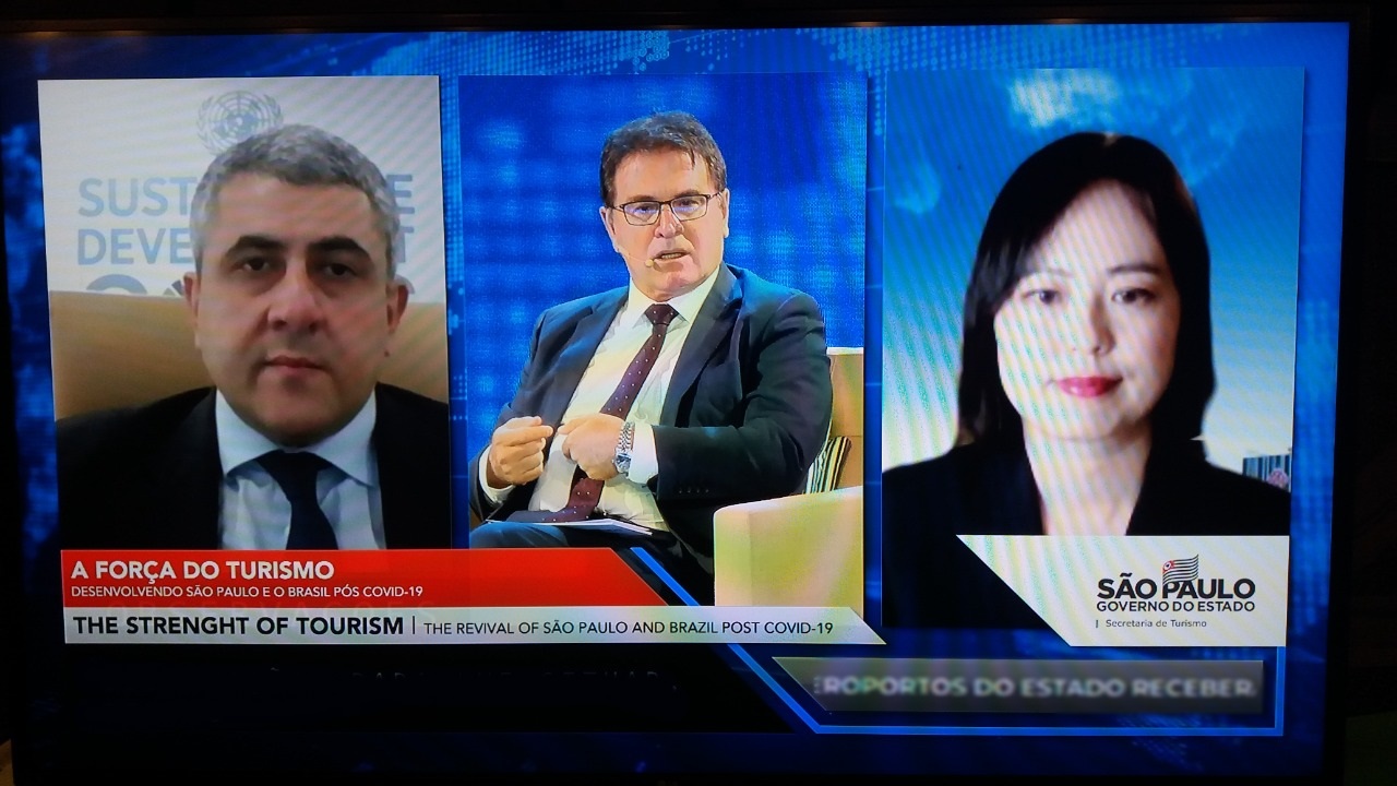 Zurab Pololikashvili, à esquerda, durante recente videoconferência realizada pela SETUR-SP (Reprodução da internet)
