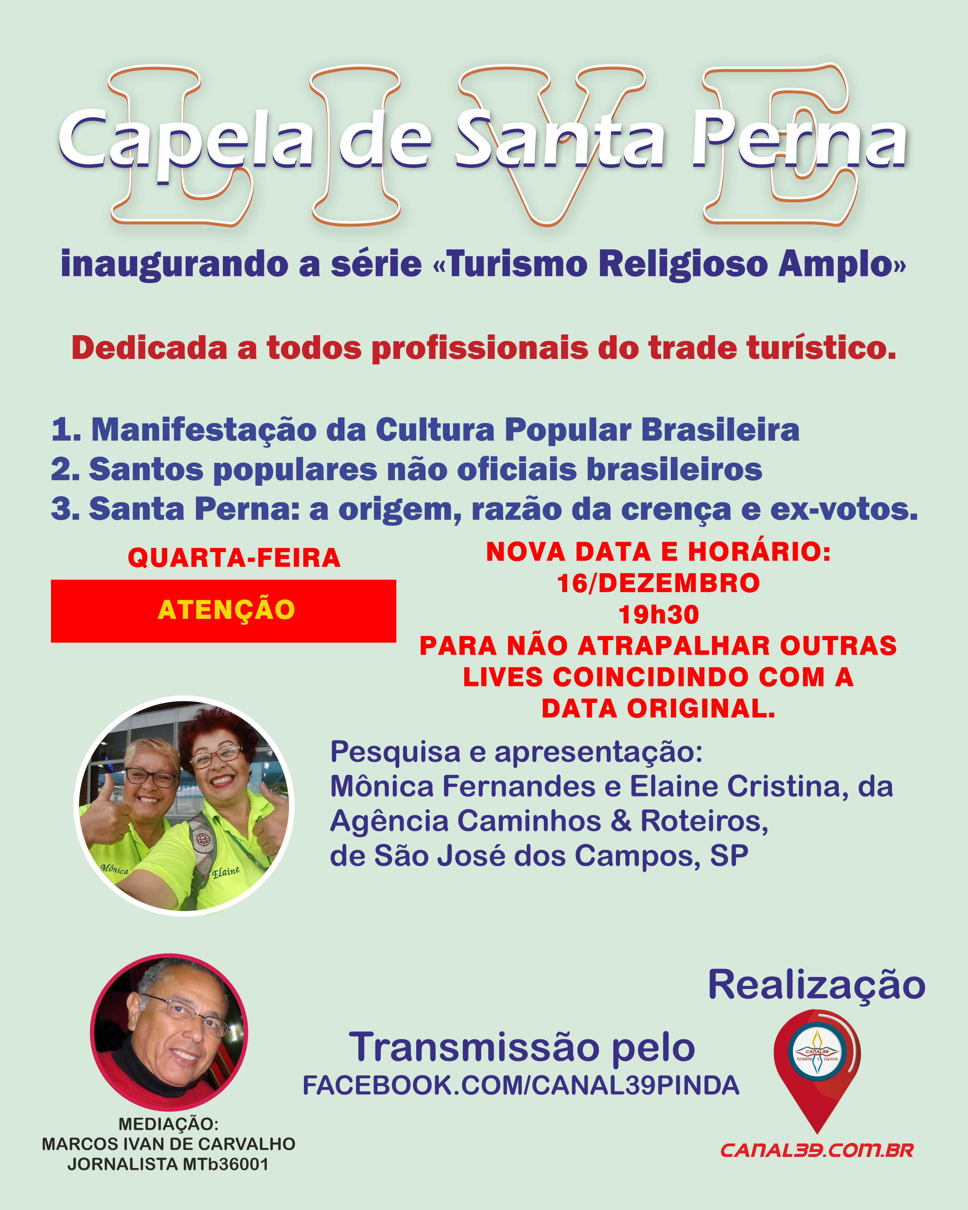 O Canal39, com ações focadas no Turismo e na Cultura, abre, no próximo dia 16 de dezembro, a partir das 19h30, uma série de apresentações virtuais a respeito do Turismo Religioso Amplo, trazendo, para os internautas e, principalmente, profissionais de Turismo, a oportunidade de acrescerem em seus planos de trabalho preciosas informações quanto à existência de locais capazes de satisfazerem a curiosidade ou a prática devocional de seus clientes.