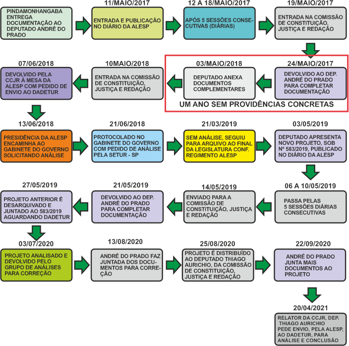 Esse parecer, de julho de 2020, foi encaminhado de volta à ALESP, pedia a complementação com documentos atualizados, com atendimento feito. Assim, o Projeto foi redistribuído à CCJR da ALESP, saindo de lá na data de 20 de abril de 2021. (Veja a "história em quadrinhos" ao lado)