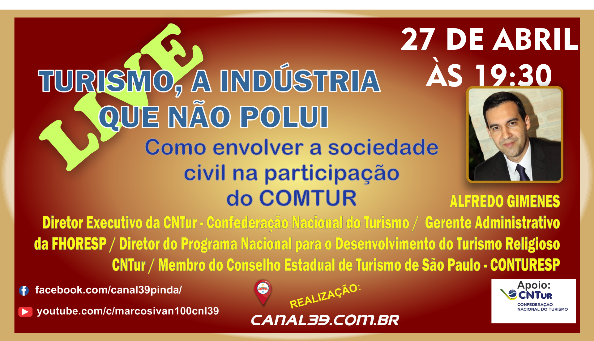 Prosseguindo com a série de eventos on-line, focados na maior motivação para a promoção do Turismo Receptivo, a direção do Canal39 anuncia, para próximo dia 27 de abril, a partir das 19h30, a presença de Alfredo Gimenes, profissional especializado em Turismo.
