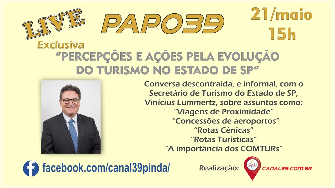 O Canal39 apresenta, nesta sexta-feira, 21, a partir das 15h, edição especial do Papo39, em formato virtual, com a presença do Secretário de Estado Vinícius Lummertz, titular da pasta do Turismo.