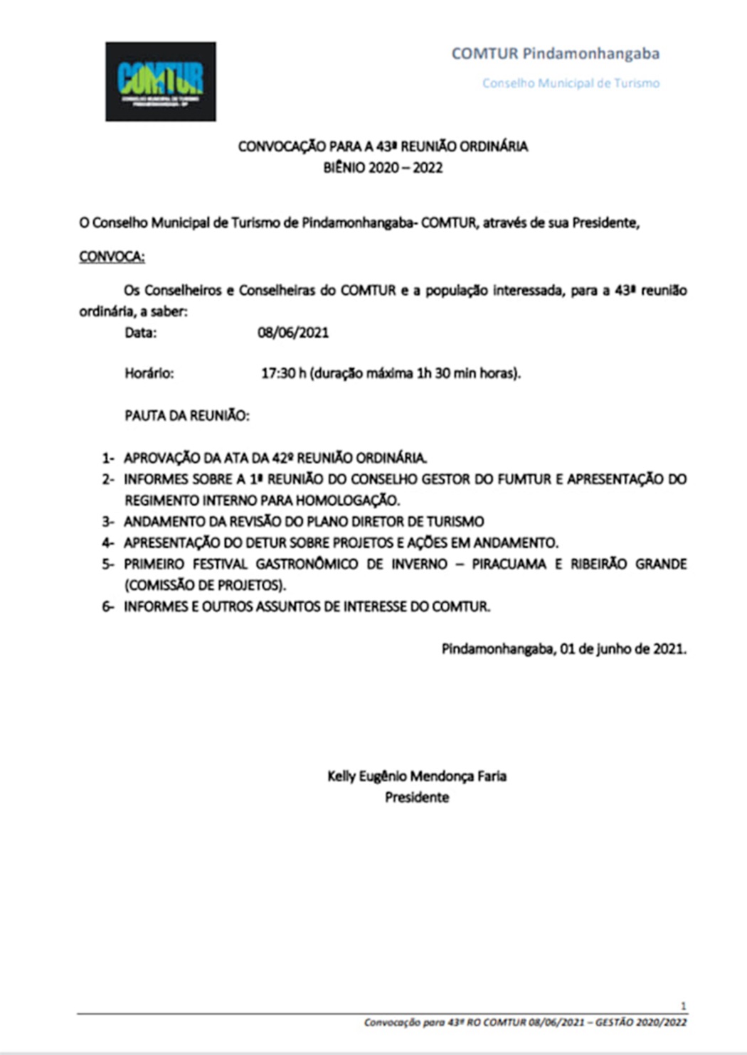 Esse texto é uma contribuição expontânea do Canal39 com o intuito de melhor divulgar as ações envolvendo o COMTUR de Pindamonhangaba, haja vista o pouco espaço disponibilizado para a divulgação de convocações para reuniões do mesmo.