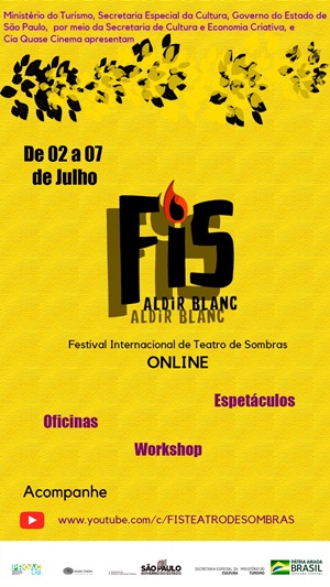 “Festival Internacional de Teatro de Sombras realiza edição especial com programação online e gratuita dos dias 02 a 07 de julho. Contemplado pela lei emergencial Aldir Blanc, o Festival realiza uma nova edição com espetáculos de diversos gêneros que contemplam o Teatro de Sombras em todo seu potencial artístico e criativo. Sua programação conta ainda com oficinas, workshops e bate-papos após cada apresentação para compartilhar com o público sobre o processo criativo e os bastidores das produções participantes.
